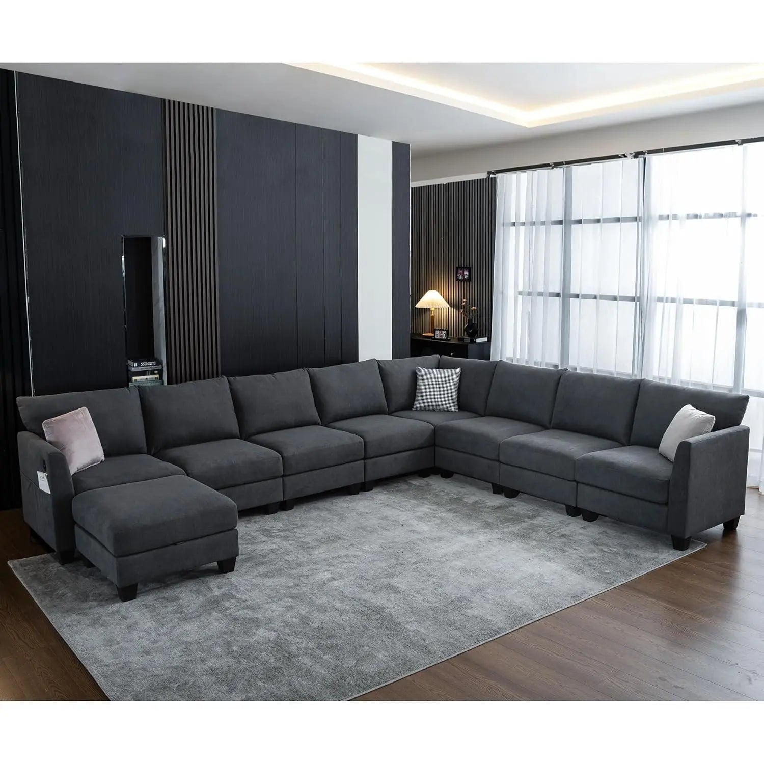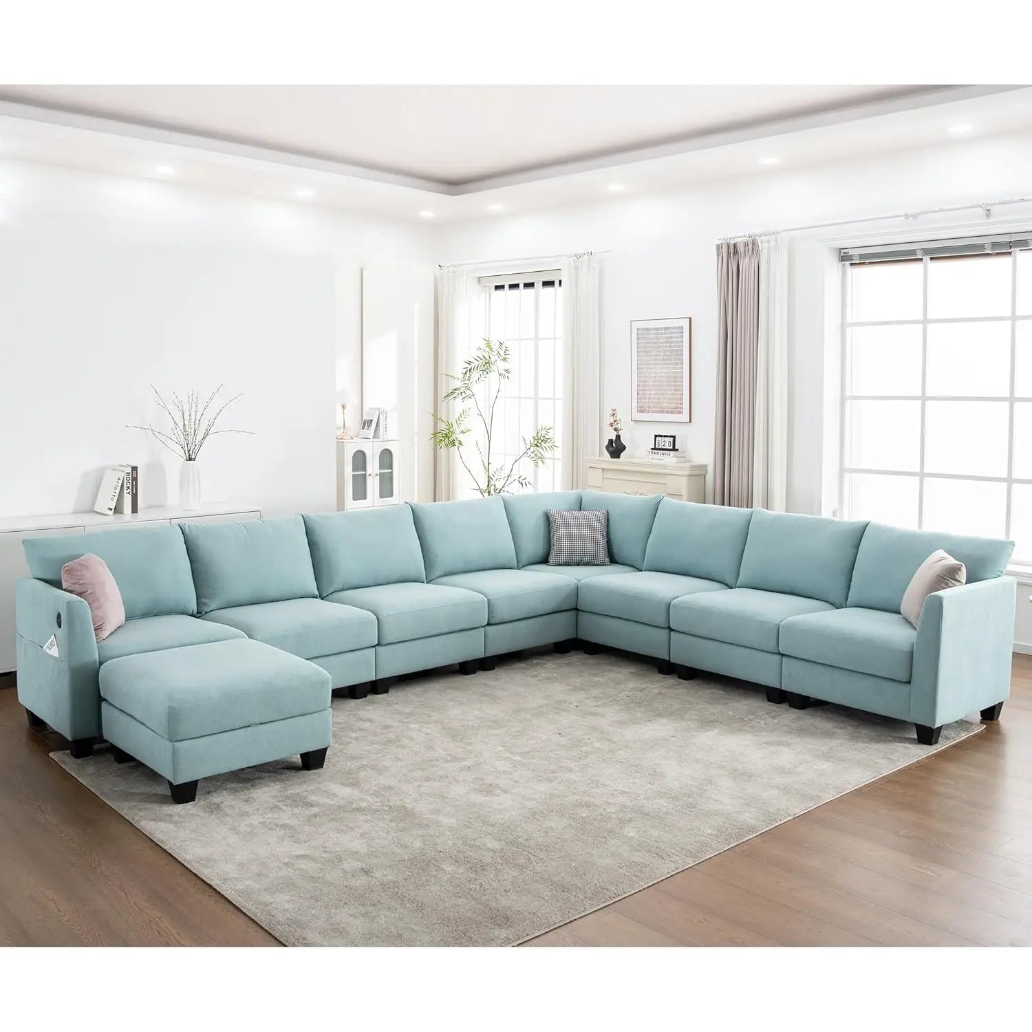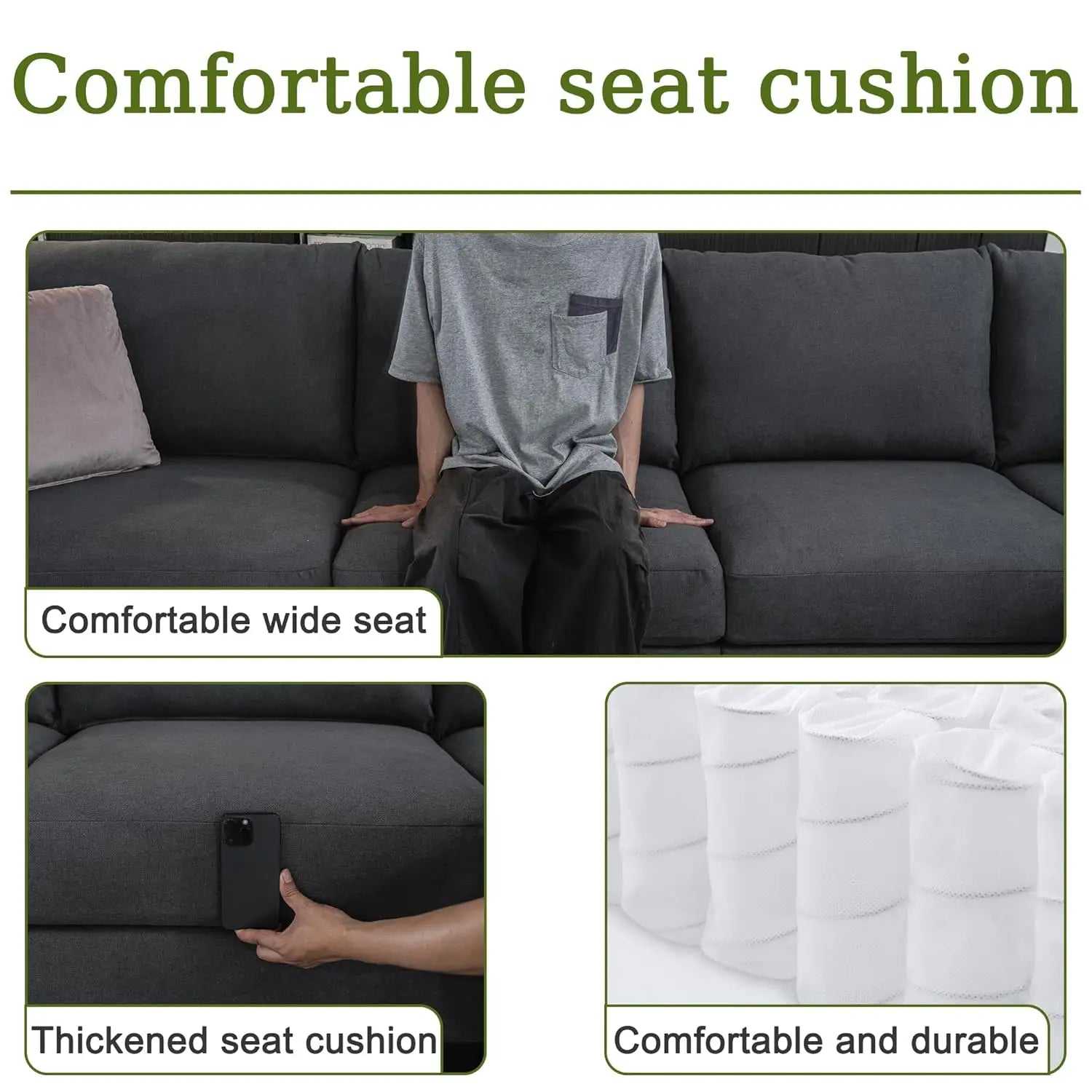 Sturdy Structure: Reinforced with a metal frame at the back and a solid wood frame under the seats, this L couch offers reliable support and prevents sagging. The high-density foam and pocket spring system, along with metal buckles securing the individual sofa section, provide lasting stability without shifting. Each seat supports up to 300 lbs, making this 8 seater sectional sofa both safe and durable