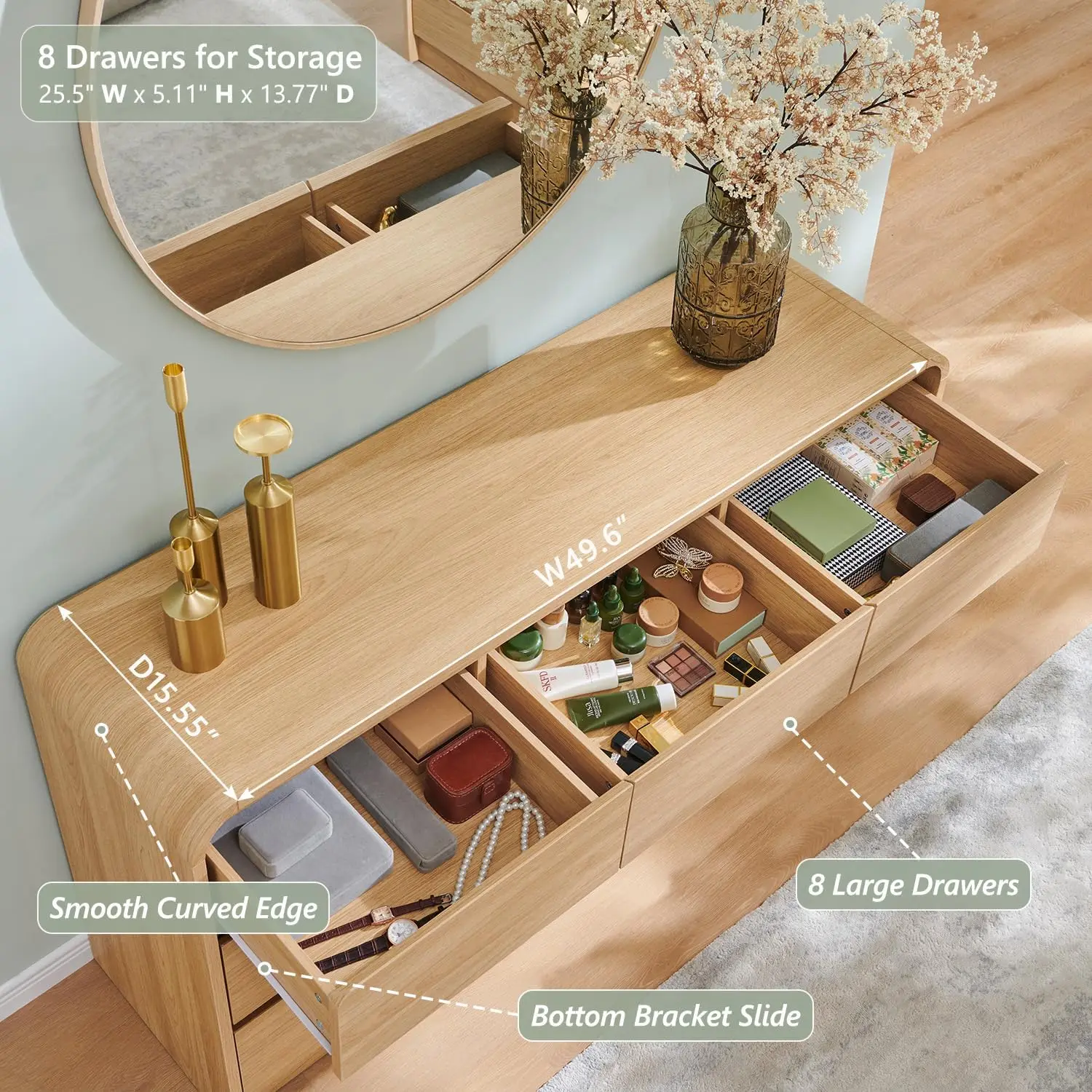 Modern 8 Drawers Dresser for Bedroom, 55" Wide Dressers & Chest of Drawers w/Curved Profile Design, Wood Mid Century Storage Dressers Organizer for Bedroom, Living Room, Natural Oak