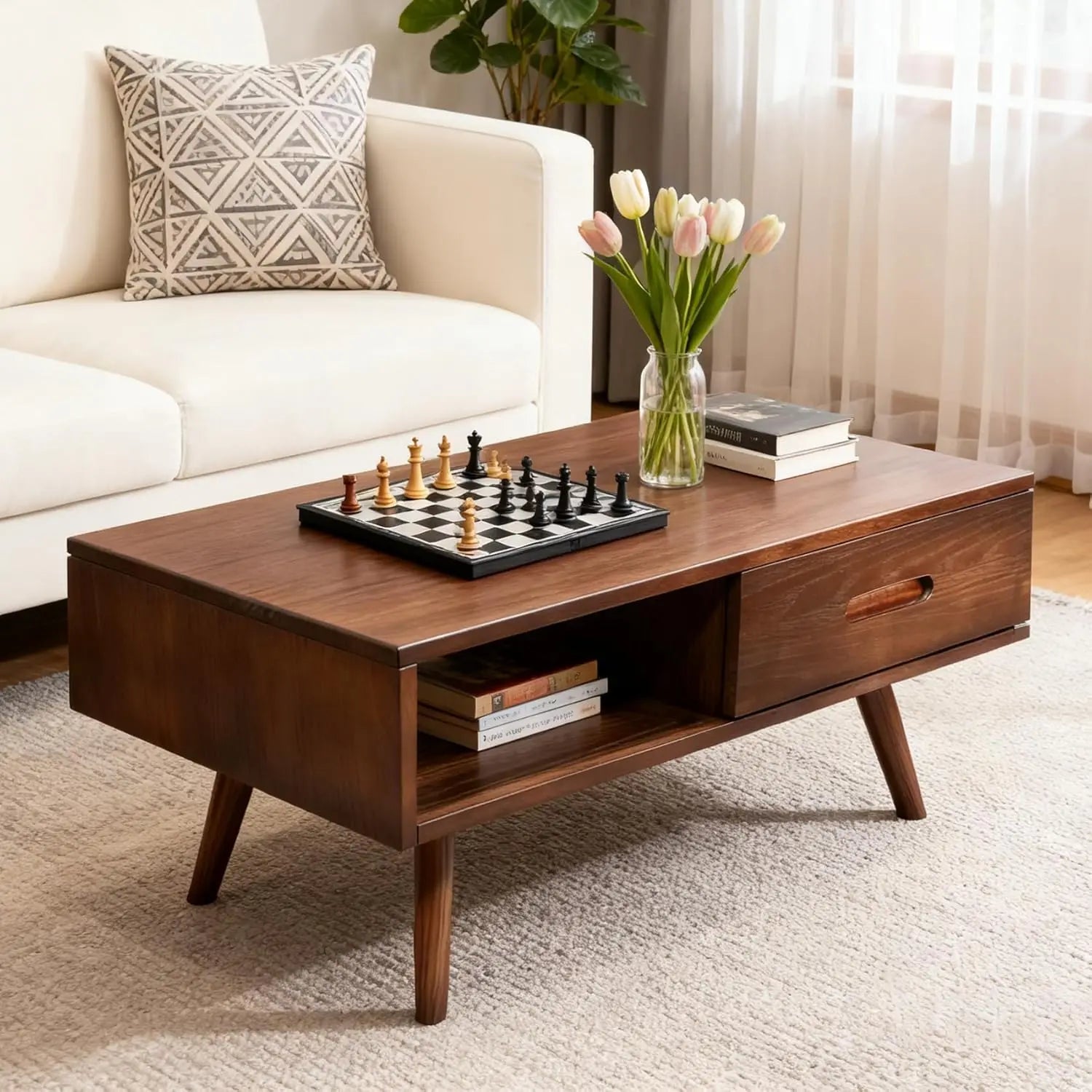 Solid Wood Coffee Table, Mid-Century Modern Coffee Tables with 2 Drawers & Open Shelf, Wooden Table for Living, Customized